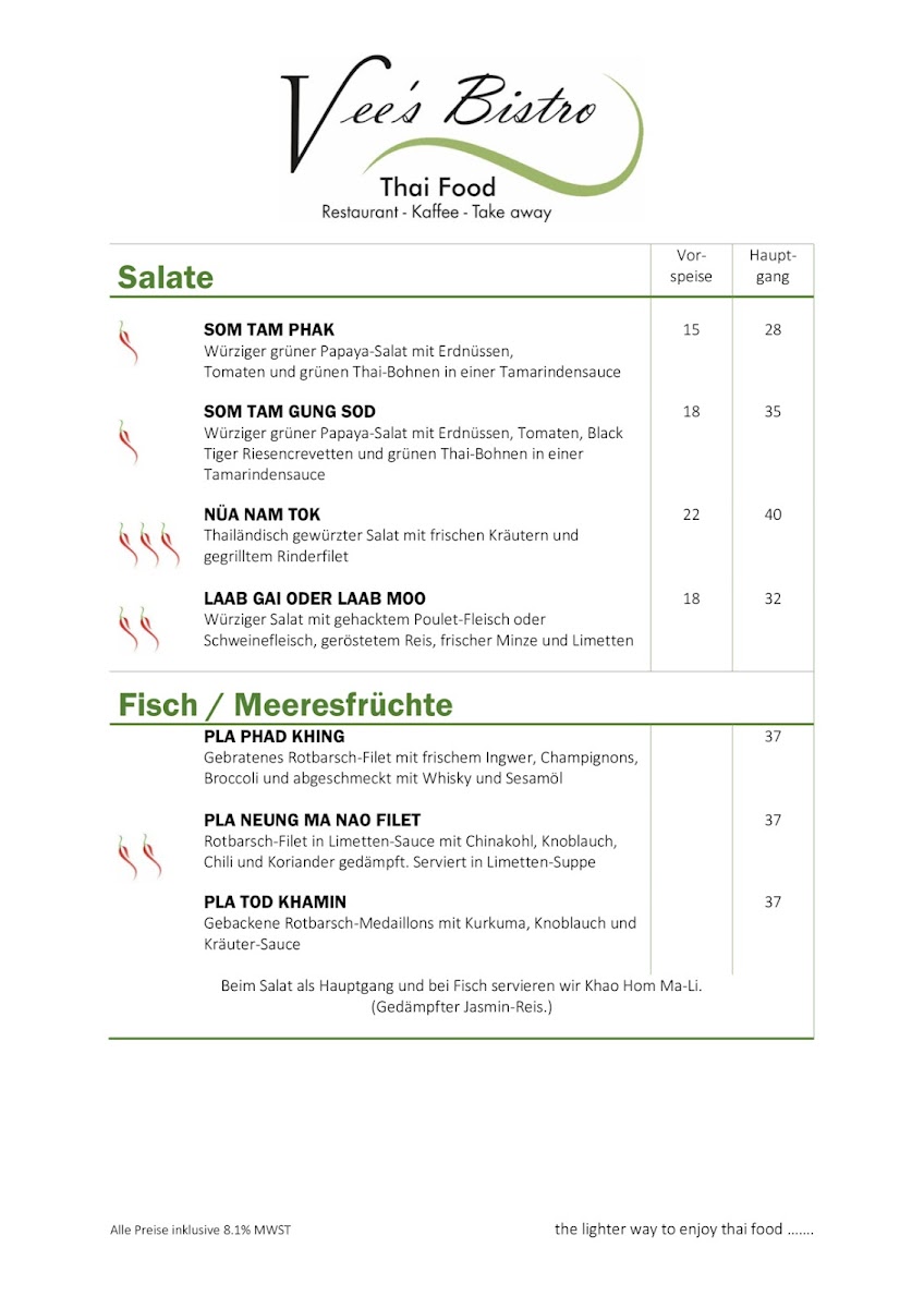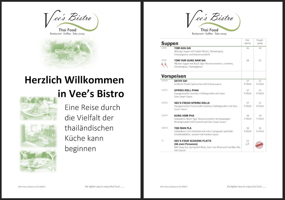 Welcome to Vees - 8002 Zurich, a charming Thai restaurant located on Alfred-Escher-Strasse, where culinary authenticity meets a cozy atmosphere. Their menu is a vibrant celebration of flavors, featuring tantalizing dishes such as Khao Pad Phak, a delightful stir-fried jasmine rice with vegetables for CHF 20.00, and the exquisite Käng Phed Ped, a red curry with duck breast for CHF 26.00.